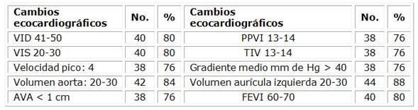Materiales y métodos: Se realizó un estudio descriptivo-analítico en una muestra conformada por 50 pacientes diagnosticados, clínica y ecográficamente, de estenosis aórtica severa.