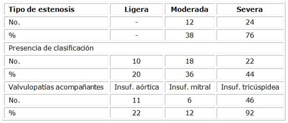 La tabla 6 muestra los resultados obtenidos con relación al tipo de estenosis aórtica. Se aprecia el predominio del grado severo con una mayor cantidad de pacientes con calcificaciones severas. Finalmente, en esta tabla se puede constatar la coincidencia de la estenosis aórtica con otras valvulopatías, como son, en primer lugar, la insuficiencia tricúspidea, seguida de la insuficiencia aórtica, y en un escaso número la insuficiencia mitral.
