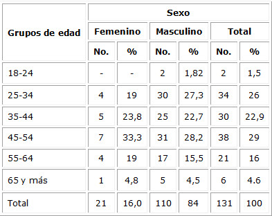 Tras el análisis de los hallazgos obtenidos, se arribaron a los siguientes resultados: predominó el sexo masculino, pues de los 131 pacientes estudiados 110 (84 %) eran de este sexo; el grupo de edad predominante fue el de 45-54 años. (Tabla 1)
