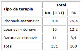 Según los datos ofrecidos en la tabla 2, de los 131 pacientes con VIH/sida que llevan tratamiento con inhibidores de la proteasa, según TARV, 104 (79,4 %) llevaron tratamiento con el ritonavir-atazanavir; el resto estuvo sujeto a otro tipo de terapia.