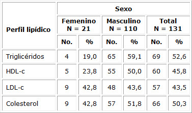 La tabla 3 muestra el perfil lipídico de pacientes con VIH/sida en tratamiento con inhibidores de la proteasa. Se observó que la LDL-c y la HDL-c están por debajo del 50 % para el sexo femenino, mientras que la última está por encima del 50 % en el sexo masculino. El resto del perfil lipídico está por encima del 50 %, siendo el de mayor porciento los triglicéridos (52,6 %), seguido del colesterol (50,3 %).