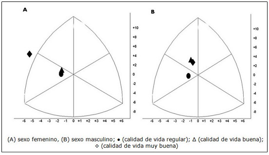 En esta se aprecia que, en el sexo femenino, las que refieren que poseen una calidad de vida muy buena se encuentran en un extremo de la somatocarta que refleja a las personas con el mayor predominio del componente endomórfico o de la adiposidad relativa. Las que mostraron una calidad de vida inferior se encuentran cercanas a la zona central de la somatocarta. En el sexo masculino se aprecia que los que ostentaron calidad de vida regular estuvieron más al centro de la somatocarta; por otra parte, los que tuvieron las mejores calificaciones se encuentran más arriba en el eje, producto de una menor adiposidad y mayor o similar desarrollo músculo-esquelético relativo.