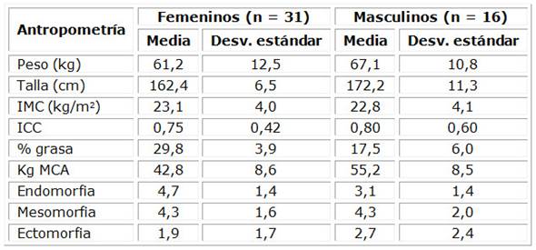 Las características descriptivas de la población en estudio se muestran en la tabla 1. El sexo femenino ostentó los mayores porcentajes de grasa y endomorfia o adiposidad relativa. Por su parte, el sexo masculino mostró en sus resultados poseer una mayor masa corporal activa, peso, estatura, y mayor linealidad.