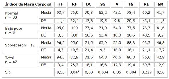 La tabla 2 muestra el análisis de las ocho dimensiones de los componentes físico y mental de la calidad de vida en general y según la categoría de evaluación del Índice de Masa Corporal. De manera general, los componentes más deprimidos fueron la salud mental, la calidad vital y la salud general de la muestra objeto de estudio.