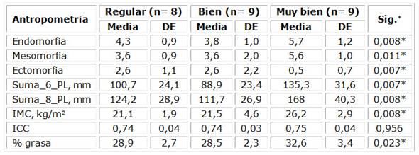 En las tablas 3 y 4 se muestran los resultados obtenidos del análisis de estadística descriptiva de la composición corporal y del somatotipo, separados por grupos según la evaluación de la calidad de vida global en el sexo femenino y el masculino respectivamente. Se aprecia que las que refirieron tener una calidad de vida muy buena fueron las que tuvieron mayor peso, endomorfia, adiposidad por la suma, índice de masa corporal, índice cintura-cadera y porcentaje de grasa. En el sexo masculino, se observó una variación entre la calidad de vida y las condiciones antropométricas más balanceadas, pero sin diferencia estadísticamente significativa.