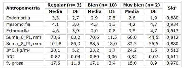 En la presente investigación, el empleo de las características antropométricas de los sujetos estudiados permitió establecer que en el sexo masculino hubo una correspondencia entre estas y su calidad de vida. Por su parte, en el sexo femenino se sobrestimó la calidad de vida, reflejado en un mayor valor de masa grasa en las que refirieron muy buena calidad de vida, así como en una subestimación de la calidad de vida de las que tuvieron mejor condición física.