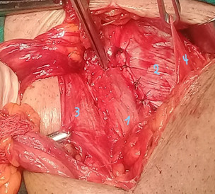 El proceder quirúrgico hasta la aponeurosis del oblicuo mayor se efectúa de forma idéntica a otras técnicas de hernioplastia, incluyendo la incisión de la misma, el tratamiento del cordón y sus elementos y el saco herniario se realiza de forma habitual. El flap interno de la aponeurosis se une al ligamento inguinal mediante sutura continua de material irreabsorbible 2/0 desde el tubérculo púbico hasta el anillo profundo, estrechando el mismo sin contraer el cordón. Seguidamente, se realiza una incisión longitudinal en la aponeurosis, formando una franja de aproximadamente 2 cm, que se extiende desde la sínfisis del pubis hasta más allá del anillo inguinal profundo, suturando el borde superior de esta franja al músculo oblicuo interno y tendón, conjunto con sutura discontinua irreabsorbible monofilamento 2/0, quedando así una nueva pared posterior por detrás del cordón. La misma tiene la condición de ser móvil, como se muestra en la figura, y la hoja interna de la aponeurosis se sutura por encima del cordón a la hoja externa de la misma (3 y 4 de la figura). Opinamos que la realización de esta técnica es más sencilla y fácil que otras, lo que es una opción quirúrgica efectiva.