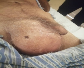 Paciente masculino de 70 años de edad, con antecedentes de hipertensión arterial esencial, tratada de manera regular. Acude a consulta por tumefacción escrotal derecha e indolora de 13 meses de evolución. Inicialmente, recibió el diagnóstico de hernia inguinal unilateral.
