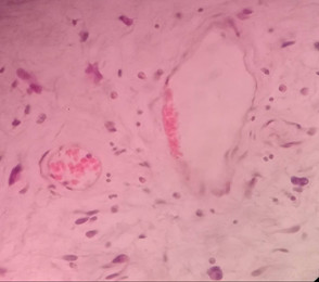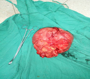 Ante la sospecha clínica de malignidad se realizó orquiectomía inguinal radical derecha y ligadura de cordón alto. En anatomía patológica se recibe la pieza quirúrgica de 2500 gramos (figura 3). Al estudio histológico (figura 4) se observa lesión tumoral mesenquimal maligna, rodeado por estroma nodular mixoide prominente. Se diagnostica liposarcoma mixoide.