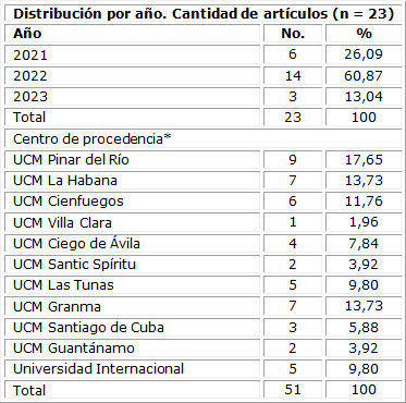 Predominó el año 2022 con 14 artículos publicados, para un 60,87 %. La UCM de Pinar del Río fue el lugar de procedencia del mayor número de autores (26,09 %), seguida por la UCM La Habana y la UCM Granma (13,73 % cada una). (Tabla 1)