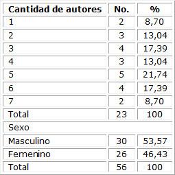 El sexo masculino resultó ser el predominante, con 30 autores (53,57 %). Los artículos con cinco firmantes fueron los que más predominaron, con un 21,74 %, seguidos por los de tres y seis firmantes (17,39 % cada uno). (Tabla 2)
