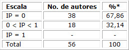 Grado de productividad de los autores: Para su determinación se empleó el Índice de productividad (IPr), que se calcula de la siguiente fórmula: IPr = logN, donde N es el número de artículos publicado por el autor. Basado en este cálculo los autores se dividen en pequeños Ipr = 0, medianos 0 < Ipr < 1 y grandes productores Ipr = 1.