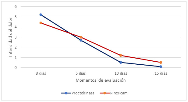 En cuanto a la intensidad del dolor, se apreció una reducción paulatina de los valores medios obtenidos en la escala visual analógica, en la medida que avanzó el tratamiento en ambos grupos, que sin que se encontraran diferencias significativas, resultó más evidente en el grupo Proctokinasa® donde a partir del 5to día se obtuvieron cifras medias inferiores a las reportadas en el grupo Piroxicam. (Gráfico)