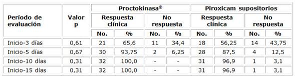 En la tabla 1 se muestra la respuesta clínica obtenida según grupo de tratamiento y momentos de evaluación. A los tres días hubo respuesta en más de la mitad de las pacientes con independencia del tratamiento recibido; en el grupo Proctokinasa® en el 65,6 % de las pacientes hubo disminución de la intensidad del dolor mayor de 20 mm en la escala analógica, mientras que en el grupo Piroxicam esta respuesta fue de 56,2 %. A los cinco días los porcentajes de respuesta clínica superaron el 85 % y en las evaluaciones realizadas los días 10 y 15 en el grupo Proctokinasa® fue del 100 %.