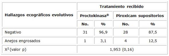 Los resultados del estudio ecográfico evolutivo al 5to día de iniciadas las terapias se muestran en la tabla 2. En 31 de las pacientes del grupo Proctokinasa® (96,9 %), el estudio resultó negativo, en el grupo Piroxicam la negativización de la ecografía se corroboró en 28 pacientes para un 87,5 %, las diferencias antes comentadas no fueron estadísticamente significativas.