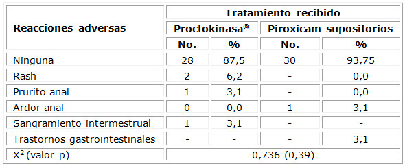 Ambos tratamientos se consideraron seguros, fueron reportados 4 eventos adversos en el grupo Proctokinasa® y 2 en el grupo Piroxicam, que se presentan en la tabla 3. No se encontraron diferencias significativas entre los grupos de tratamiento respecto a esta variable.