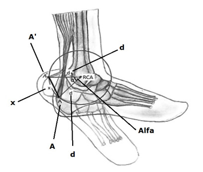 Las distancias entre el centro de rotación del tobillo a los puntos A' y A, se denotan con la letra d. El ángulo creado por las líneas A' y A se designa como alfa (ɑ). La letra X es la distancia entre los puntos A' y A. De ahí que para calcular la distancia del alargamiento (DAC) se emplea la siguiente formula: DAC = √2d2(1-cos(ɑ)).12,14 (Figura 1)