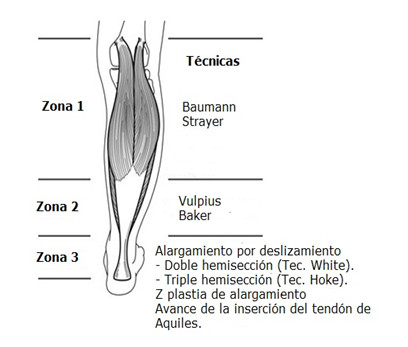 El propósito del tratamiento quirúrgico es lograr la dorsiflexión del tobillo con la rodilla en flexión, y cinco grados o más con la rodilla en extensión. Las indicaciones del tratamiento quirúrgico son: pacientes con deformidad en equino estática y dinámica, que no responden al tratamiento conservador. Por su parte, las técnicas quirúrgicas se encuentran agrupadas por zonas del complejo músculo-tendinoso.15-17 (Figura 2)