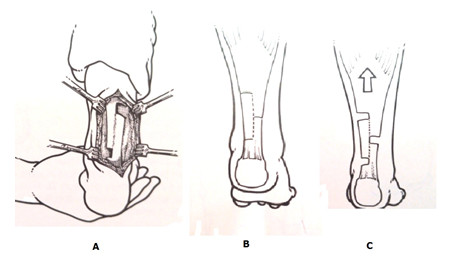 Para determinar la longitud del tendón a alargar, existe un método que consiste en tomar como punto de referencia el centro de rotación del tobillo situado en el centro del círculo de la superficie articular talocrural. Se define A' a la inserción del tendón de Aquiles en la posición de deformidad en equino que presenta, y A a este mismo punto, solo que en extensión de la articulación de forma imaginaria después de la cirugía.