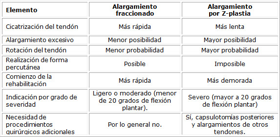 Las técnicas de alargamiento fraccionado y de Z-plastia son las más empleadas en pacientes con deformidad en equino. Para la realización de esta técnica se arriba al tendón mediante un abordaje de piel posteromedial, se secciona el tendón en su porción central según la longitud necesaria, después se corta el lado medial distal, para luego hacerlo del lado lateral proximal. Una vez que el tendón fue dividido, se coloca el tobillo en posición neutral y se lleva a cabo la sutura del tendón de tipo término-terminal o de lado a lado.24,25