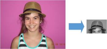 Como el problema se centra solo en imágenes de rostro de fondo uniforme y los sombreros siempre se encuentra en una misma región relativa a las personas, se decidió, con el fin de reducir el área de búsqueda, seleccionar de la imagen la región en la que debe estar el sombrero. Esto se hace convirtiendo la imagen a escala de grises y a partir de la detección del rostro de la persona, se realiza un escalado de manera que sus ojos queden a una distancia de 20 píxeles y finalmente se selecciona una región de la imagen que se extiende desde la mitad del rostro hacia arriba, con un ancho y alto no mayores de 100 píxeles. Si el rostro no fuese detectado, entonces la imagen es escalada a una altura de 200 píxeles. En la figura 1 se muestra el resultado de aplicar este proceso para una imagen de ejemplo.