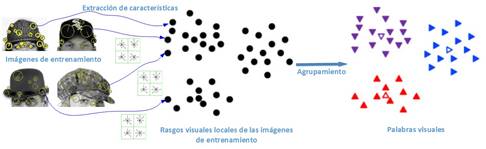 Generar un diccionario y mapear los rasgos a palabras visuales: Un diccionario visual es un método que divide el espacio de descriptores visuales en varias regiones. Los rasgos de una región corresponden a la misma palabra visual. Entonces, una imagen se codifica como un histograma de la frecuencia de ocurrencia de cada palabra visual. Esto se hace asignando a cada vector de rasgos de la imagen su región más cercana, de manera que al terminar el proceso se tenga la cantidad de vectores asignados a cada región y se asigna esa cantidad a la componente correspondiente a esa palabra visual en el histograma.