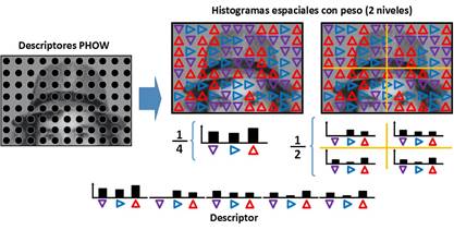 Para describir las imágenes se utilizo un esquema de Emparejamiento Piramidal Espacial (Spatial Pyramid Matching), donde se plantea el cálculo de histogramas de frecuencias de las palabras visuales a distintas resoluciones de la imagen. En algunos artículos como (LARA and Jr., 2011; HADJIDEMETRIOU et al., 2004) las diferentes resoluciones se determinan mediante repetidos submuestreos de la imagen y computan un histograma global de los valores de los píxeles para ese nivel, se varía la resolución a la que los rasgos son calculados (valores de los píxeles), pero la resolución del histograma (escala de intensidad) se mantiene fija. En artículos como (GRAUMAN and DARRELL, 2005; LAZEBNIK et al., 2010) se plantea un enfoque opuesto, fijar la resolución a la que se determinan los rasgos, pero variar la resolución espacial en la que son agregados. En este trabajo se propone un Emparejamiento Piramidal Espacial variando ambas resoluciones.