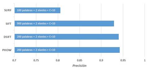 A partir de estos resultados, se procedió a la clasificación de las restantes 100 imágenes usando solo PHOW, para determinar el método de extracción de características, la cantidad de palabras y el nivel de profundidad para el análisis espacial de mejor precisión. La tabla 1 muestra los resultados obtenidos para estos experimentos.