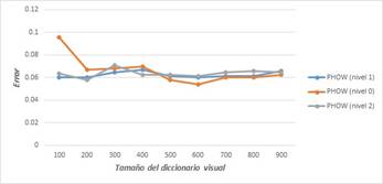Un resumen de los resultados obtenidos para los diccionarios generados mediante el método PHOW hasta nivel 2 de profundidad se representa en el gráfico 5, donde se observa hasta aproximadamente un 6% de error como promedio en las 10 divisiones aleatoria en algunos casos, así como para diccionarios pequeños es mejor seguir un enfoque espacial mientras para los más grandes analizar solo la imagen completa es lo más conveniente.