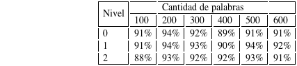 Analizando los valores mostrados en la tabla 1 para PHOW, se nota que procesar la imagen de manera global (nivel 0), así como descender demasiado (hasta nivel 2), produce resultados poco estables, obteniéndose hasta una precisión por debajo del 90%. Mientras que para el nivel 1, se registran valores de precisión más estables para todos los tamaños del vocabulario visual, superando en todos los casos el 91%. A su vez, se tiene que el tamaño del vocabulario con mejores índices de precisión es M = 200, alcanzando hasta 93% y mostrando los mejores valores para los primeros niveles, factor decisivo en la eficiencia ya que estos son los que operan con vectores de menor dimensión y por tanto generan un menor número de operaciones.