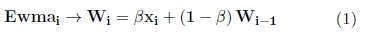 xi is a random variableβ is a constant to determine the weight of the observations, (0 < β < 1)Wi is the current value of EWMAWi−1 is the previous value.In this work, the equation 1 is used to determine the weight of the base classifiers. In this case, Wiis the weight of each classifier and xi the current accuracy. As each classifier uses a change detector, it can be estimated at any time the error Em of each base classifier and the accuracy is 1 − Em.β can be used as a factor to adjust the weights of the base classifiers.