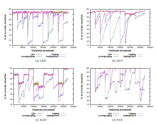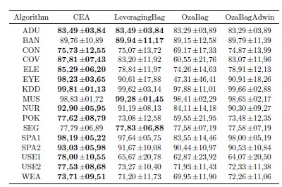 The proposed CEA algorithm was compared with the algorithms based on online bagging. The algorithms used in the experimental study are available in MOA. Specifically, included OzaBag (online version of the bagging algorithm) (Oza and Russell, 2001), OzaBagAdwin (Bifet et al., 2009) and LeveragingBag (Bifet et al., 2010b). The contending algorithms were set with the default configuration adopted by MOA (Bifet et al., 2010a). In the case of CEA we use λ = 6, and β = 0.875. The number of classifiers of the contending algorithms in MOA is 10. Therefore, in CEA the number of classifiers was set to 10.