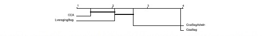The concept drift problem can be more adverse in real-world situations. The real world datasets included in this section have been used in several studies on concept drift (Table 1). For these datasets, there is no strong claim about the presence or type of change. Similar to the results obtained from the synthetic datasets, CEA often reached higher levels of predictive accuracy and when outperformed, its accuracy was very similar to that of the winner. Figure 2 shows the ranking position of the algorithms with respect to Table 2 and Table 3. To verify significant differences, we used the Friedman test and the Holm procedure for the post hoc analysis. Groups of classifiers that are not significantly different (at p = 0.05) are connected. This figure shows that, in general, CEA ranked significantly better than the contending algorithms, excepting LeveragingBag.