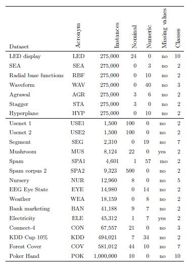 The experiments considered both artificial (LED, SEA, RBF, WAV, AGR, STA, HYP) and real-world datasets (see Table 1). The artificial datasets have the benefit of modeling different scenarios where the algorithms can demonstrate their performance. We can distinguish two types of datasets, those that are oriented to test abrupt changes, and those that introduce gradual changes. Furthermore, other characteristics can be added, like artificial noise, irrelevant attributes, etc. Regarding abrupt datasets, the common idea that supports their operation is the generation of distinct concepts that are active in different periods. The change between concepts is immediate (abrupt change), although the extent of the change could simulate a gradual change in some way. Thus, if two consecutive concepts are very similar, it could be considered that the speed of the change is low. The artificial datasets were generated by the MOA software (Bifet et al., 2010a).
