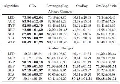 The Table 2 summarize the predictive performance of the algorithms over abrupt and gradual changes in terms of the average and standard deviation. The highest levels of predictive accuracy are in bold. The Table 2 reflects that the proposed algorithm often outperformed the algorithms LeveragingBag, OzaBag, and OzaBagAdwin. In RBF and SEA, consecutive concepts were configured to be very similar. Additionally, the Figure 1 reflects that CEA is often able to adapt to concept drifts more quickly than the contending algorithms. We can also see that CEA is able to stabilize the learning when concepts are stable.