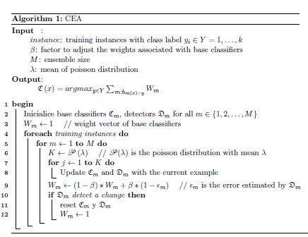 The proposed algorithm called CEA uses the online version of the bagging algorithm to train the base classifiers and the EWMA method to determine the weights of the classifiers. CEA manipulate concept changes in a simple and efficient way (see algorithm 1). Each base classifier Cm (1 < m < M ) uses a change detector