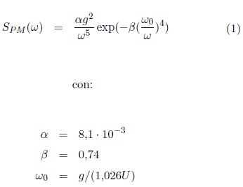 En donde g es la gravedad y U es la velocidad del viento a una altura de 10m sobre el nivel del mar. La frecuencia pico ωp, es la frecuencia angular para la cual las olas tienen en su mayoría energía promedio. La ecuación 2 representa su forma de cálculo para este espectro.