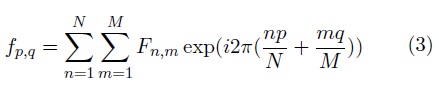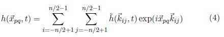 = (kx,i, ky,i) = (2πi/L, 2πj/L) para un ancho L de la superficie representada. Además p, q, i, j son números enteros, tal que −n/2 ≤ p, q, i, j < n/2 y n, m son enteros positivos relacionados de la siguiente manera n = 2m .