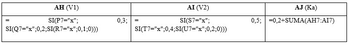 Para el cálculo del coeficiente de argumentación las funciones a definir (Tabla 4) para la casillas correspondientes a la fila 7 y columnas AH (V1), AI (V2) y AJ (Ka) son: