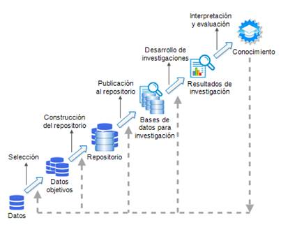 Desarrollo de investigaciones: es donde el o los investigadores utilizan los datos descargados del repositorio para realizar y validar su investigación. Como salida, en este proceso se generan nuevos datos, que es el resultado de la aplicación de los algoritmos o métodos de la investigación al juego de datos inicial. Las bases de datos empleadas en la investigación deben ser debidamente referenciadas. La salida a este proceso son los resultados de la investigación.
