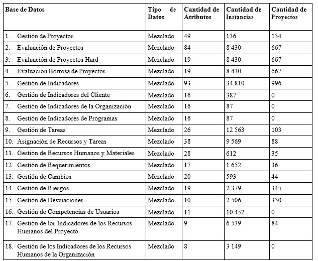 Existen diferentes repositorios de bases de datos internacionales para el desarrollo de investigaciones (Kolisch & Sprecher, 1996). Uno de los repositorios más reconocidos es el UCI Repository (Catherine Blake, 1998)(C Blake & Merz, 2015) para aprendizaje automático que incluye numerosas bases de datos de disímiles campos de aplicación. El PSPLIB (Kolisch & Sprecher, 1996) por su parte es especializado en bases de datos para la asignación de recursos, útil en la prueba de técnicas de optimización. En (Pérez Pupo, 2011) (Santiesteban et al., 2016) se hace un análisis de repositorios de datos y se identifica que no cubren las necesidades de investigaciones en la temática de gestión de proyectos.