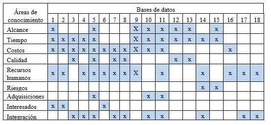 En la Tabla 2 se muestra un breve análisis en el que se manifiesta la relación de las bases de datos del repositorio con 9 áreas de conocimiento de la gestión de proyecto propuestas por el PMBOK y la ISO 21500.