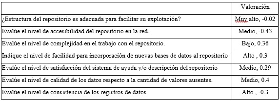 En general se manifiesta un alto nivel de satisfacción en el uso del repositorio. Respecto a la variable pertinencia el criterio con menor puntuación fue el nivel de exclusividad del repositorio elemento que se debe a la existencia del repositorio PSPLIB para el desarrollo de investigaciones asociadas a la resolución de problemas de optimización. Pero realmente no se ha encontrado por parte de los autores de este trabajo otros repositorios públicos para el desarrollo de investigaciones en gestión de proyectos de software. Respecto a la variable usabilidad los criterios con más baja evaluación fueron: el nivel de accesibilidad del repositorio, la calidad de los datos respecto a la cantidad de valores ausentes y la satisfacción respecto a la ayuda en el uso del repositorio. Son elementos que se deben continuar trabajando por parte de los autores para garantizar mayores niveles de uso del mismo.