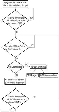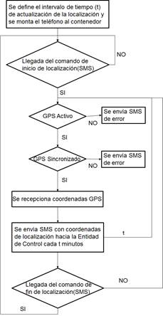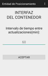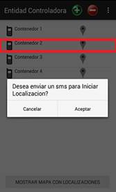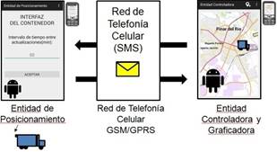 A cada contenedor, previo al comienzo del traslado, se le colocó en su exterior un teléfono inteligente con sistema operativo Android. Este constituye la entidad de posicionamiento y a su vez, es el encargado del envío de la posición a través de mensajes cortos SMS de la red de telefonía celular pública. Para proveer la información de localización geográfica utiliza el módulo GPS que viene asociado a dichos teléfonos, que le permiten capturar las señales de los satélites de GPS. En esta entidad se instala una aplicación que a la llegada de un SMS con un texto que tenga un determinado código de Iniciar localización, este empiece automáticamente a enviar su posición cada cierto tiempo, previamente configurado en la aplicación y que puede ser variable en dependencia de las necesidades de cada empresa o de cada contenedor particular de una empresa. Esta posición se enviará vía SMS hacia la entidad de control. Esta inicia el proceso con el envió del código de Inicio de localización vía SMS y está constituida también por un teléfono inteligente Android y que actuará como una estación de control.