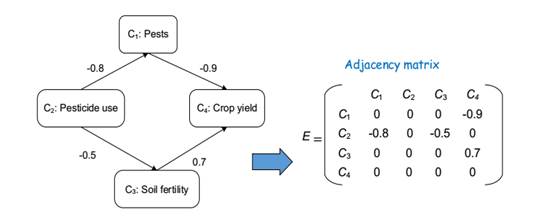 Además de una función f, que mantiene acotada la activación de cada concepto dentro del rango [0, 1]. La Figura 1 muestra el FCM y la matriz de peso de un ejemplo sobre la utilización de los insecticidad en el rendimiento de un cultivo (Mourhir et al., 2017).