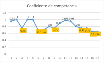 El instrumento se aplica a 17 candidatos entre ellos profesores de la Facultad de Ciencias Agropecuarias de la Universidad Central "Marta Abreu" de las Villas con más de 10 años de experiencia en la docencia; además de ingenieros y obreros de la UEB de "Cultivos Varios del Valle del Yabú" con vasta experiencia en el manejo agronómico en casas de cultivo. Se establece como criterio de selección k ≤ 0.8 pues según (Feria et al., 2018) representa un coeficiente de competencia del experto alto. De los resultados que se muestran, 9 expertos cumplieron con el criterio establecido (Figura 2).