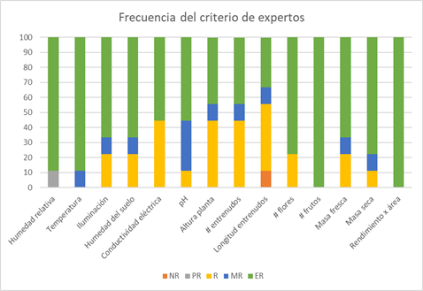 De las variables analizadas se calificaron como extremadamente relevantes la humedad relativa, la temperatura, la iluminación, la humedad del suelo, la conductividad eléctrica, el pH, el número de flores y frutos, la masa fresca, la masa seca y el rendimiento. El número de frutos y el rendimiento fueron calificados por todos los expertos de extrema relevancia por ser fundamentales en el proceso productivo.
