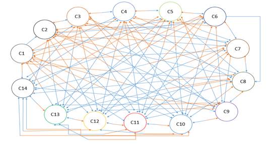 (1)En la metodología del modelado con FCM, al inicio, los ingenieros del conocimiento (expertos) identifican los conceptos clave y sus condiciones iniciales dentro del caso de estudio específico. Después, identifican las relaciones causales entre estos conceptos y, en tercer lugar, estiman las relaciones causales. Así, el FCM reúne no solo los elementos y sus relaciones sino también las fortalezas de las interconexiones correspondientes (Stylios y Groumpos, 2004).