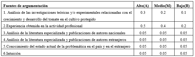 La selección de los expertos se determina por un coeficiente k = ½ (kc + ka), donde kc representa una medida del nivel de conocimientos sobre el tema investigado y ka una medida de las fuentes de argumentación. El cálculo de kc requiere de la autoevaluación del candidato en una escala de 0 a 10, donde el valor seleccionado se divide por 10 para lograr cierta normalización. Respecto al cálculo de ka, también es necesario que el encuestado se autoevalúe, pero atendiendo a seis posibles fuentes de argumentación en una escala tipo Likert. Para ello, debe completar marcando con x en cada fila de la Tabla 1, donde los números constituyen los pesos asignados a cada fuente y aparecen ocultos en el instrumento. Con los valores de la tabla patrón para cada una de las celdas marcadas por el experto, se calcula ka que no es más que el número de puntos obtenidos en total (Zambrano et al., 2015).