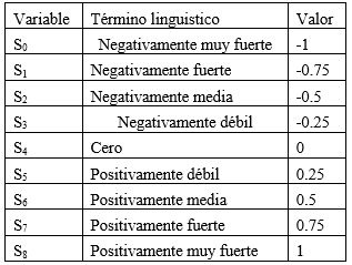 El segundo grupo de encuestas, posee como objetivo determinar las relaciones causales entre los conceptos determinados en las primeras encuestas. Cada experto debe valorar la correlación entre los conceptos mediante un conjunto de términos lingüísticos difusos S propuestos por (Pérez, 2014) que se exponen en la Tabla 2, que visualiza el dominio de valores (-1; 1), donde los valores positivos expresan la implicación directa y los valores negativos la implicación inversa (Mar et al., 2015).